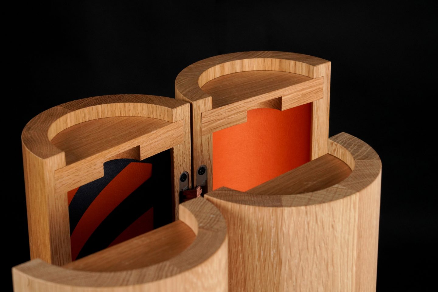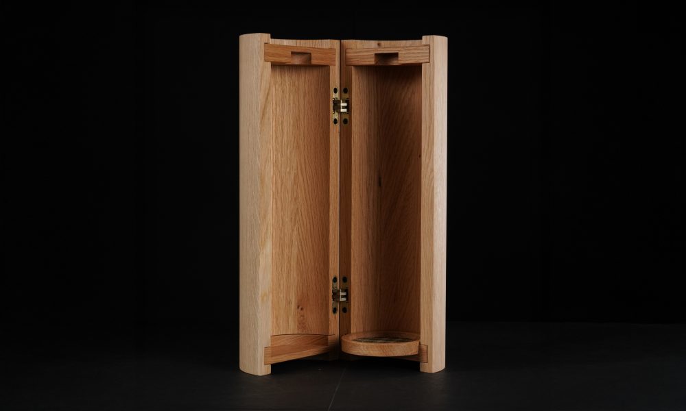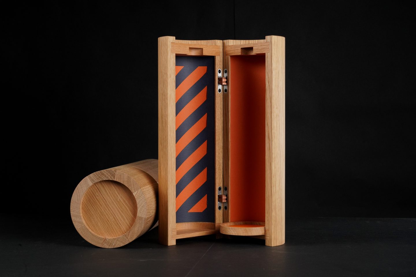 A hinged, cylindrical box with a bold, sculptural feel. Opens with precision to reveal the bottle inside — built to impress and made to last.